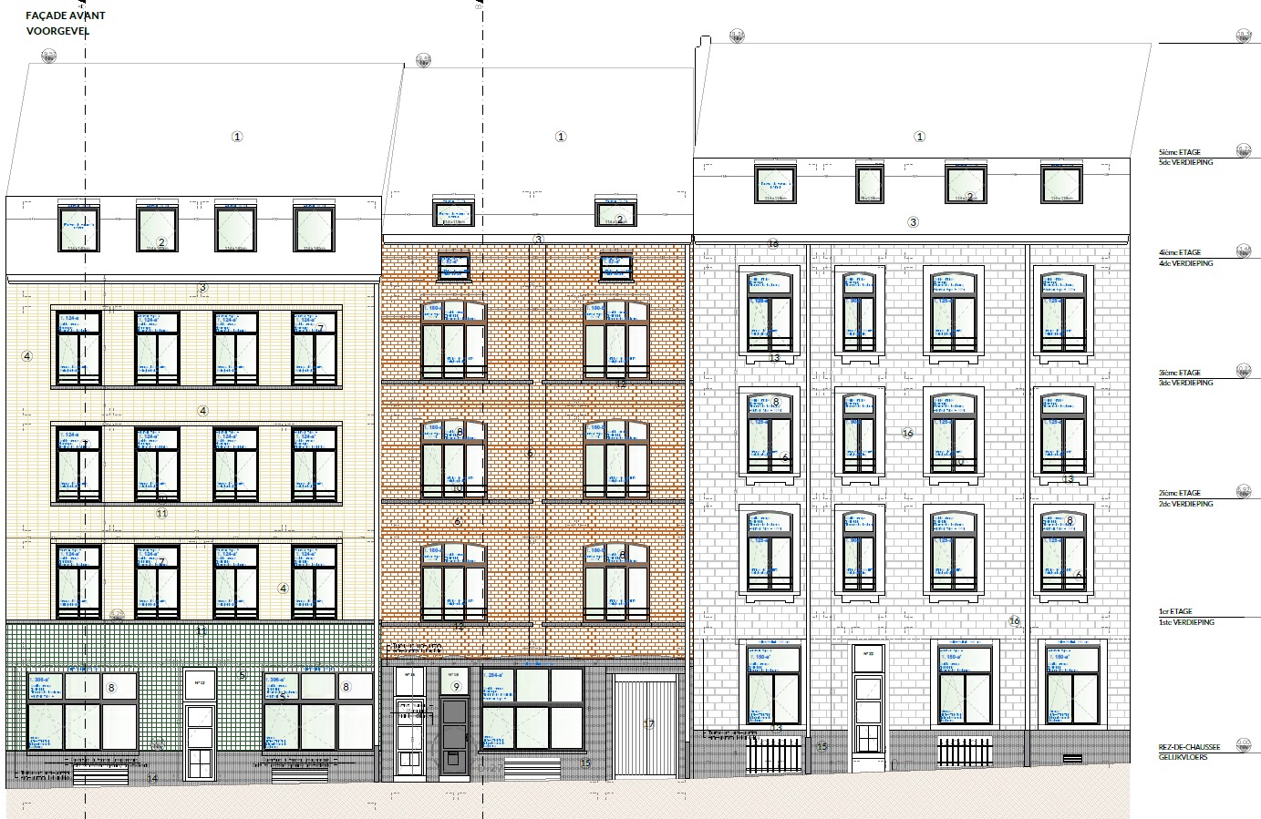 Het project combineert aluminium en hout, wat zorgt voor een evenwicht tussen moderne uitstraling en natuurlijke warmte. De uitvoering gebeurde in verschillende fases, elk met een eigen karakter en kleuraccent, waardoor de gevel een volledig vernieuwd en verfijnd uitzicht kreeg.
